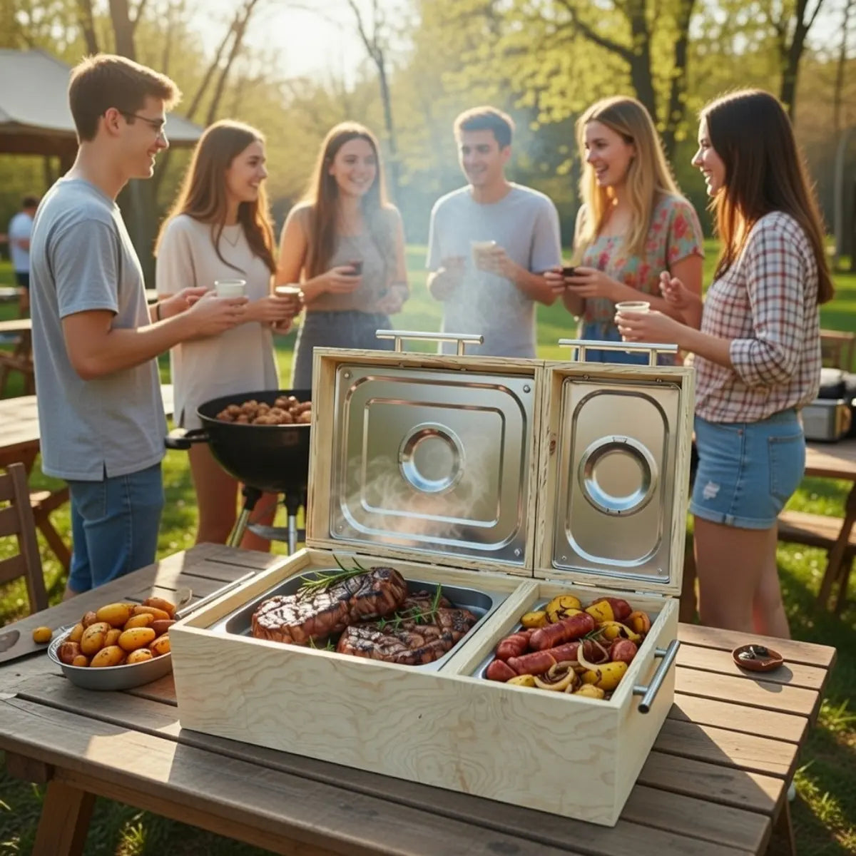 Con capacidad para 5-7 kg de carne y guarniciones, doble inserto de acero inoxidable para mantener todo caliente por horas y asas robustas para transportar fácilmente, facilita presentar cortes jugosos en reuniones familiares grandes, dominicales con amigos o eventos al aire libre. Un detalle emotivo y funcional que hará sentir único a papá, esposo, suegro, amigo o compadre: lo usará en cada ocasión y recordará siempre con cariño, superior a opciones comunes.