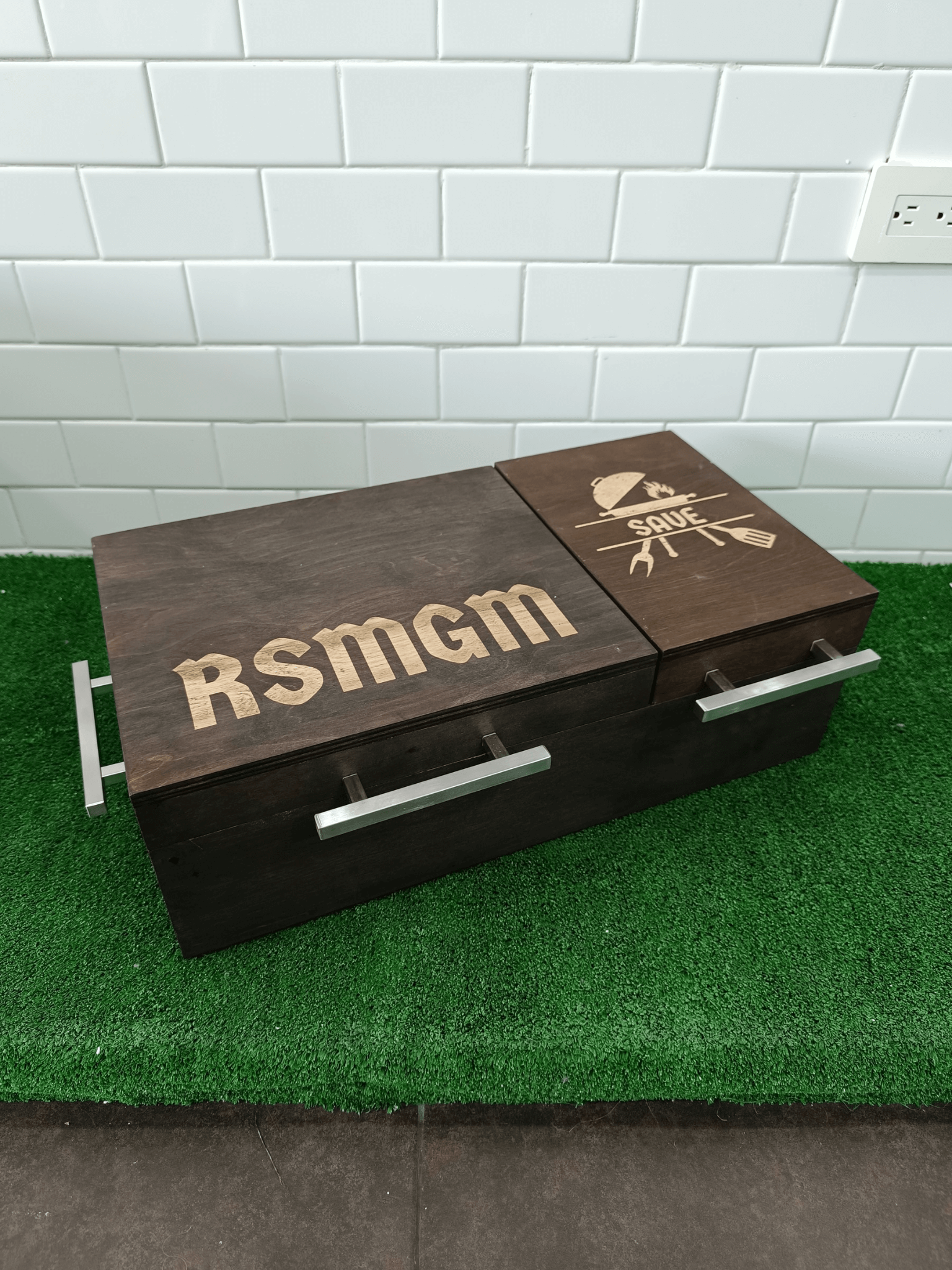 Para los que buscan espacio y una experiencia completa, presentamos esta Mega Caja de madera de pino premium con grabado láser en ambas tapas, ofreciendo una personalización sin límites para mantener la carne asada caliente, funcionando como una hielera.