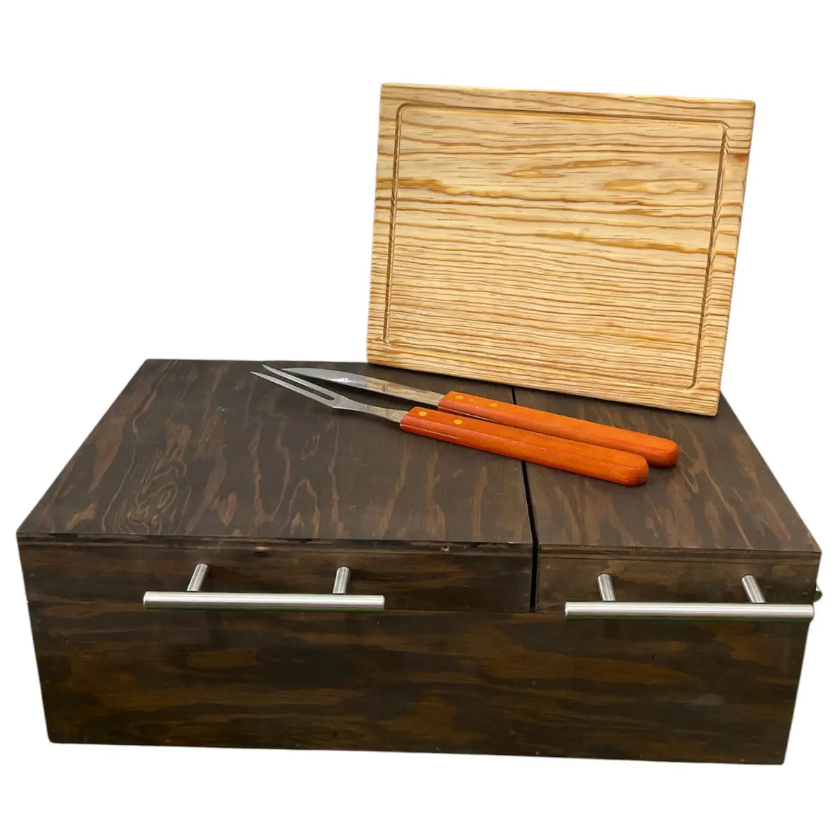¡Arma una carne asada completa con nuestro Mega Kit de Pino Veteado: el regalo definitivo para asados grandes y memorables! Esta caja de madera de pino con vetas visibles naturales ofrece un estilo rústico auténtico, capacidad de 6-7 kg con doble inserto de acero inoxidable para organizar más alimentos y mantener todo caliente por horas. Incluye una tabla de picar de pino grabada con láser, más utensilios: cuchillo y tenedor largos para asador, también grabados con láser en el mango.
