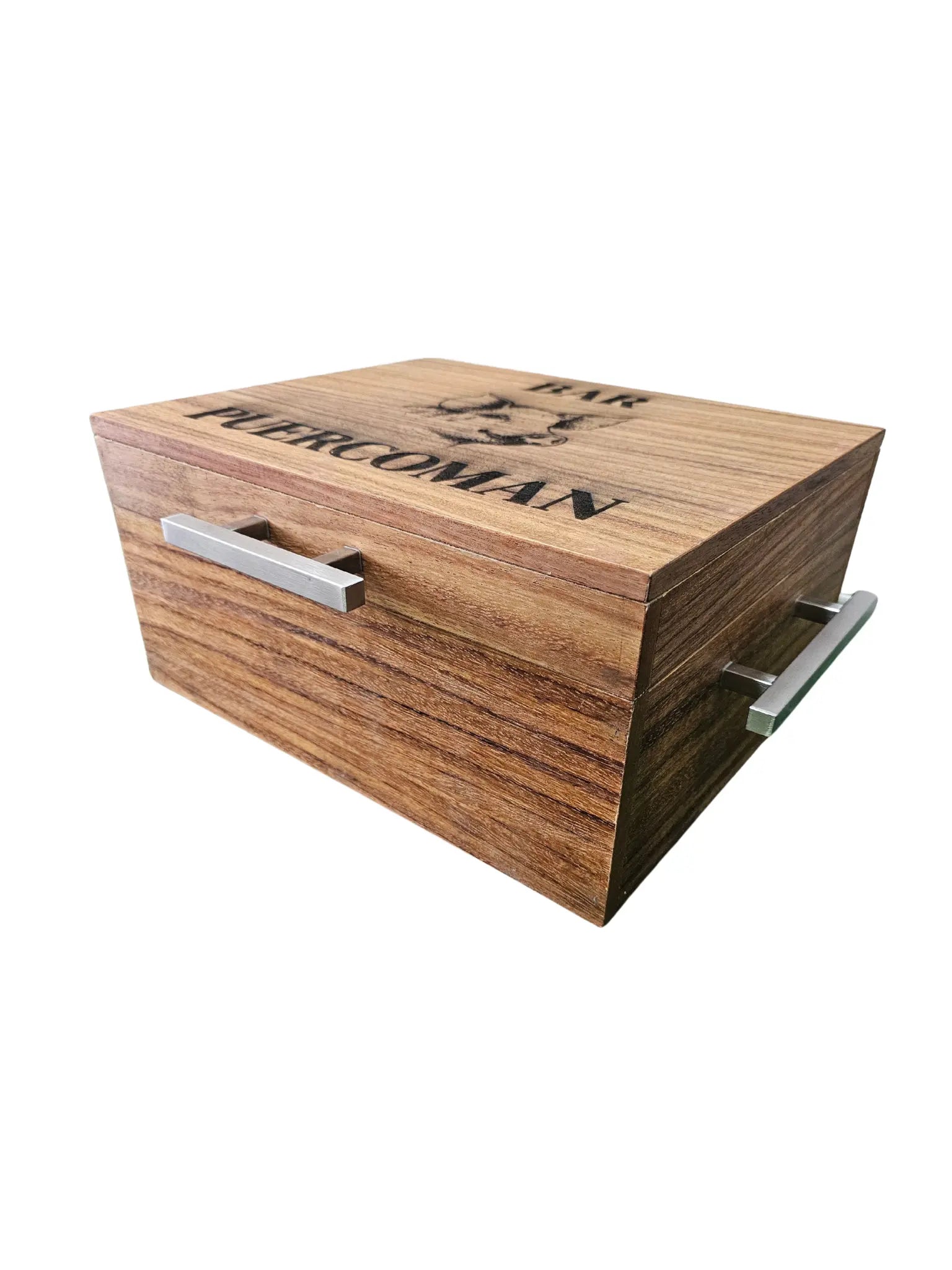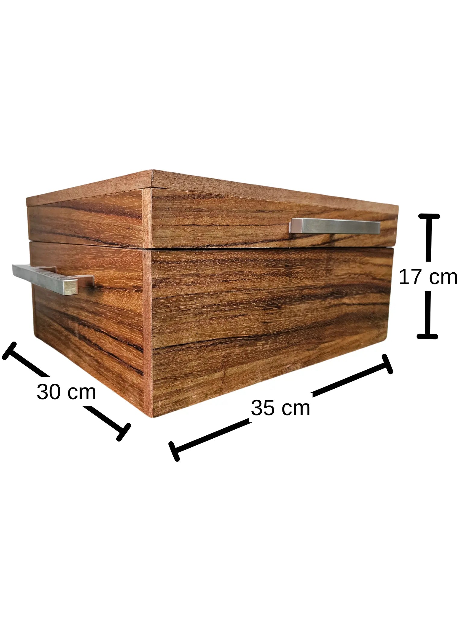 Con un acabado elegante que resalta la belleza de la madera parota, esta caja de 35 cm x 30 cm x 17 cm es más ligera que las versiones sólidas, perfecta para quienes buscan practicidad sin sacrificar estilo.