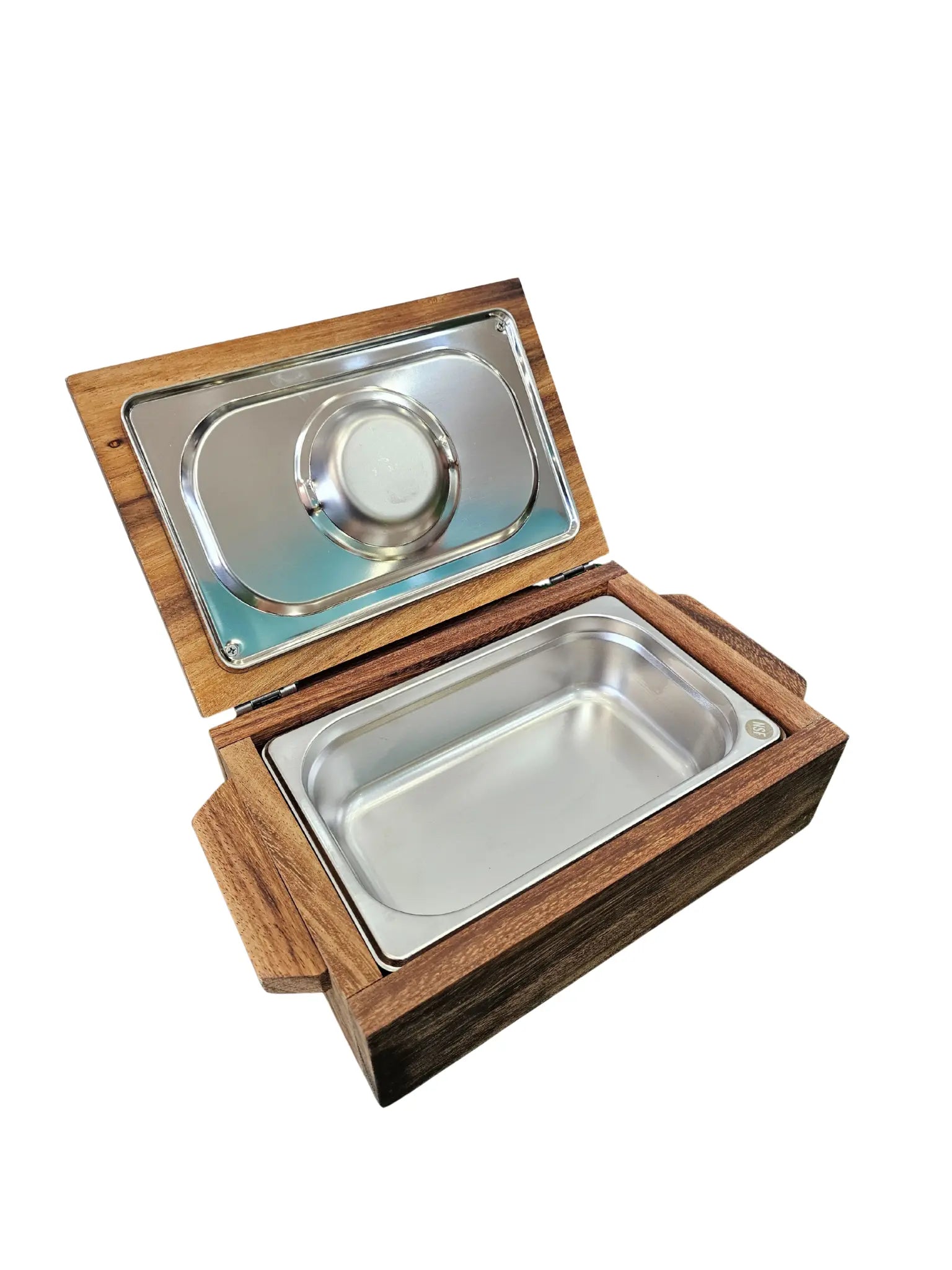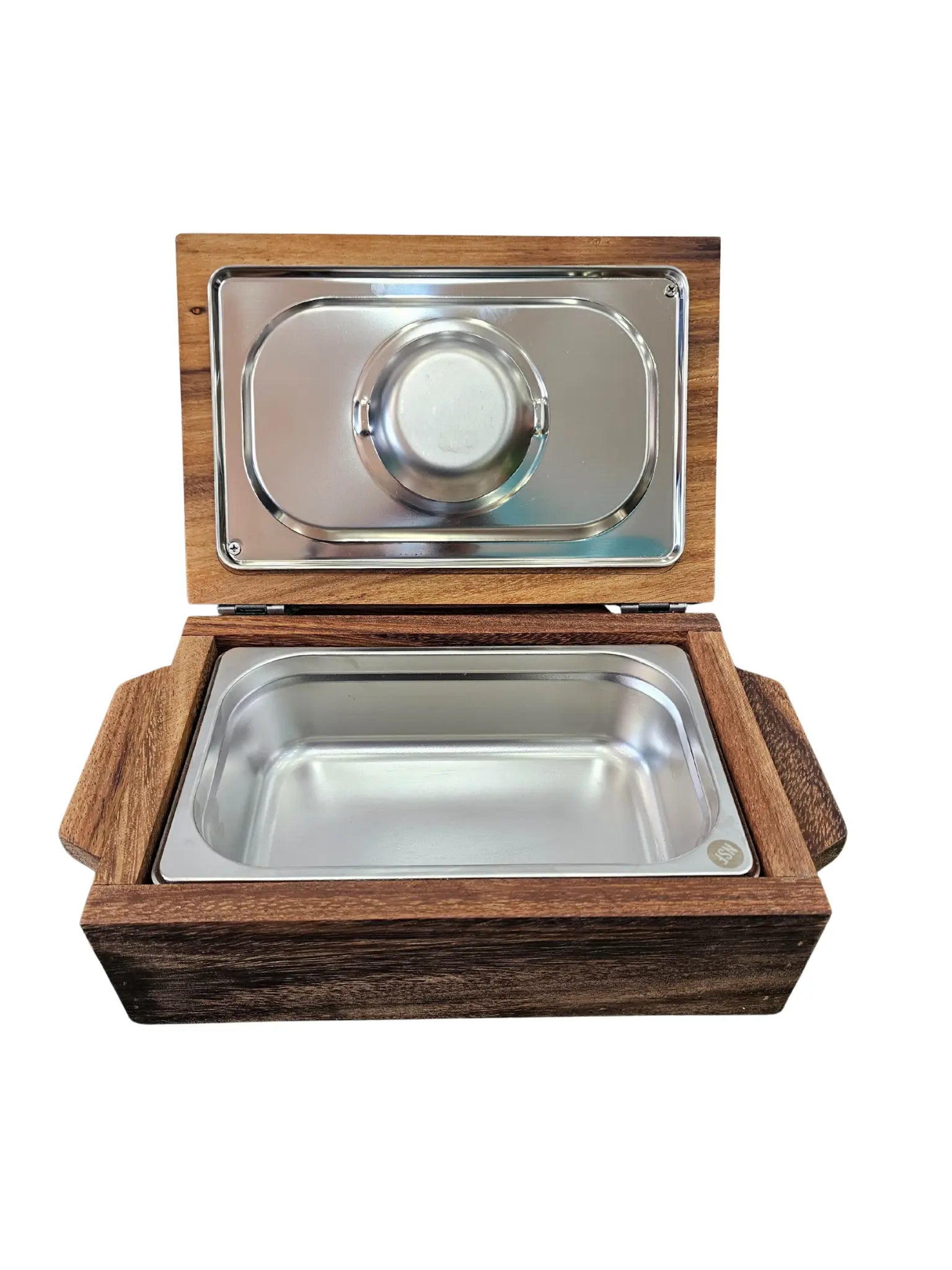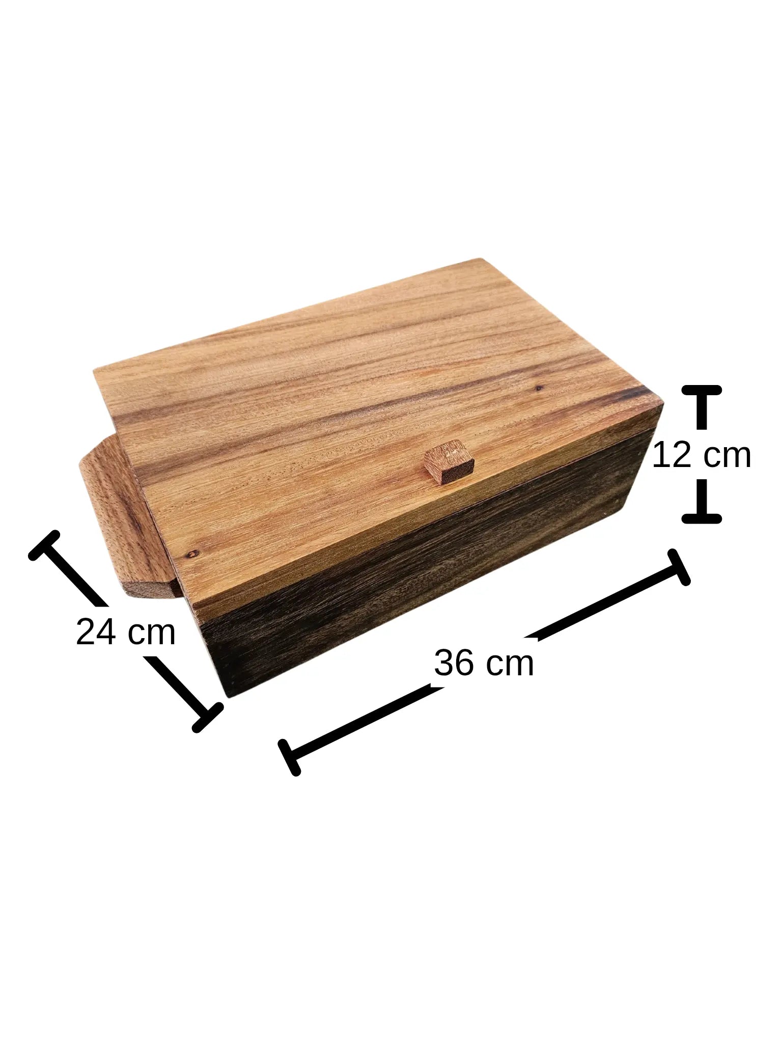 Fabricada en madera sólida de parota, esta caja con inserto de acero ofrece un diseño lujoso y funcional.