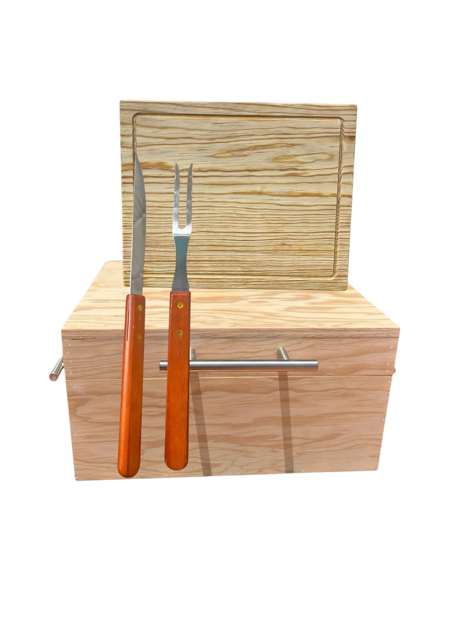 Viene con una tabla de picar y utensilios para una carne asada completa.