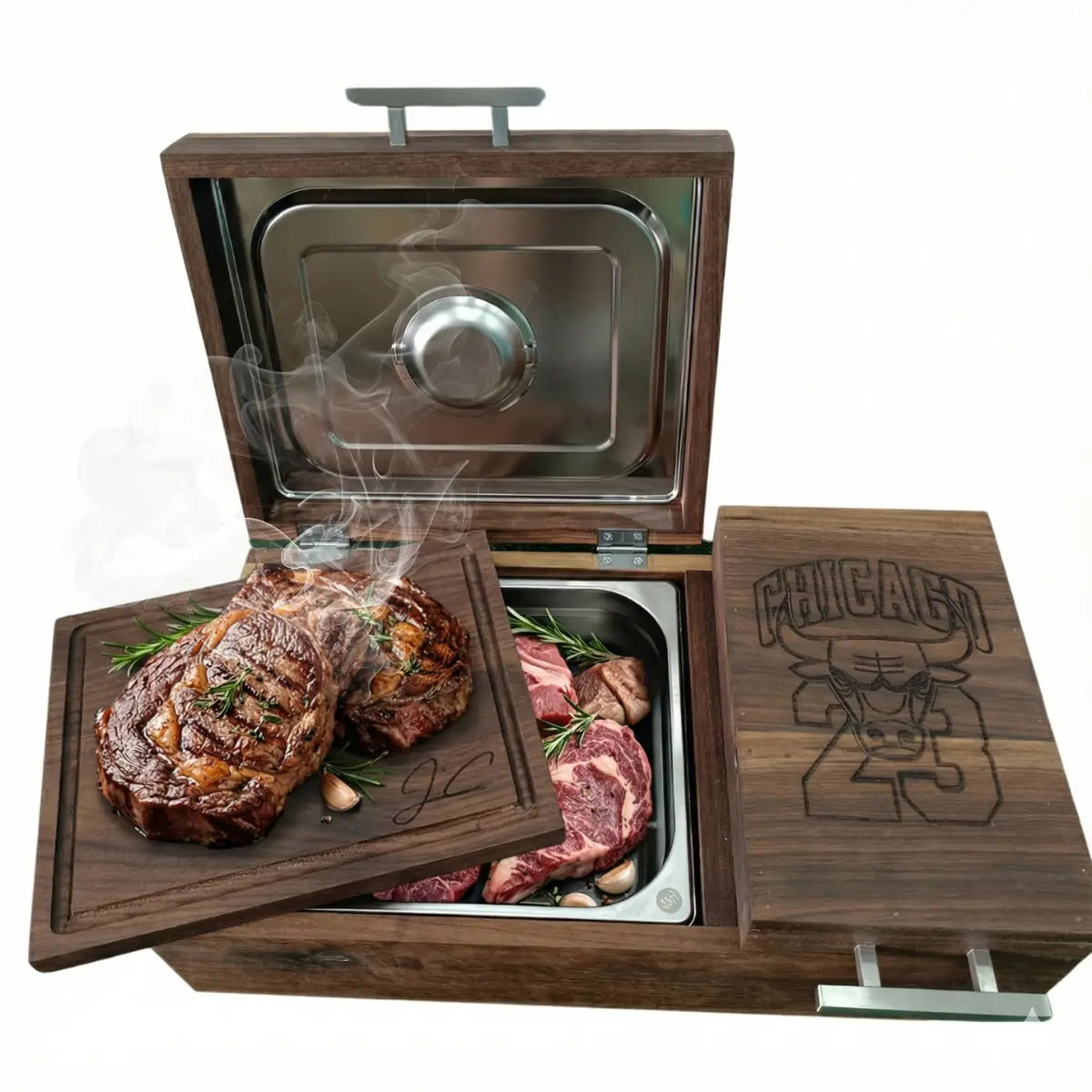 - Retención de calor: La caja contiene un inserto de acero inoxidable en su interior, que junto con la madera crea un aislante perfecto para mantener caliente la carne de la barbacoa.